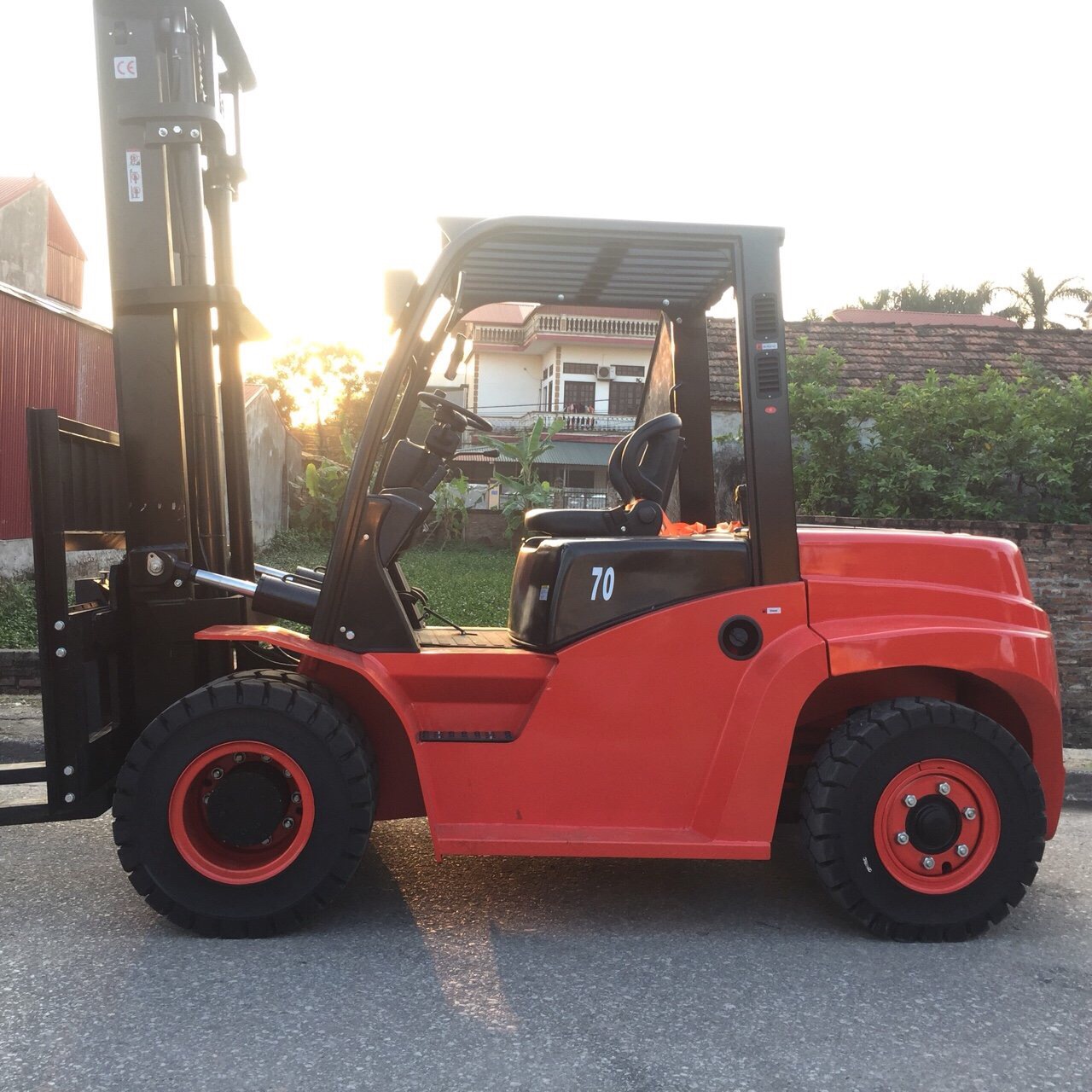 2. Xe nâng hàng trung quốc 7 tấn model CPCD70 T8 có những ưu điểm gì?Xe nâng hàng EP 7 tấn CPCD70 T8 được đánh giá là một trợ thủ đắc lực không thể thiếu đối với ngành công nghiệp và sản xuất. Vì nhờ có thiết bị này mà hàng hóa được di chuyển, nâng hạ một cách nhanh chóng, dễ dàng, từ đó giúp tiết kiệm thời gian cũng như chi phí và giảm việc sử dụng sức người hiệu quả. Sản phẩm sở hữu những ưu điểm vô cùng nổi bật như sau: – Sử dụng động cơ diesel tăng áp hoạt động bền bỉ và hiệu quả có thể tạo ra lực để xe nâng hoạt động dễ dàng và giảm mức tiêu thụ năng lượng cho xe. Chính vì vậy, giúp tiết kiệm nhiên liệu đáng kể trong quá trình hoạt động. – Xe được thiết kế với kích thước vừa phải, không quá đồ sộ để tăng khả năng sử dụng trong mọi địa hình, không gian nhỏ hẹp khó xoay trở. Cabin dòng xe nâng được thiết kế rộng giúp người lái xe mở rộng tầm nhìn và điều khiển xe nâng một cách hiệu quả. – Thiết bị được thiết kế hệ thống phanh và các đoạn đầu hoàn toàn tách biệt, giúp xử lý hiệu quả các tình huống phát sinh đột ngột nên luôn đảm bảo sự an toàn cho cả tài xế và hàng hóa. – Phần lốp xe được thiết kế có thể thay thế các lốp đặc để tăng độ bền cũng như hạn chế được các sự cố trong quá trình sử dụng.
